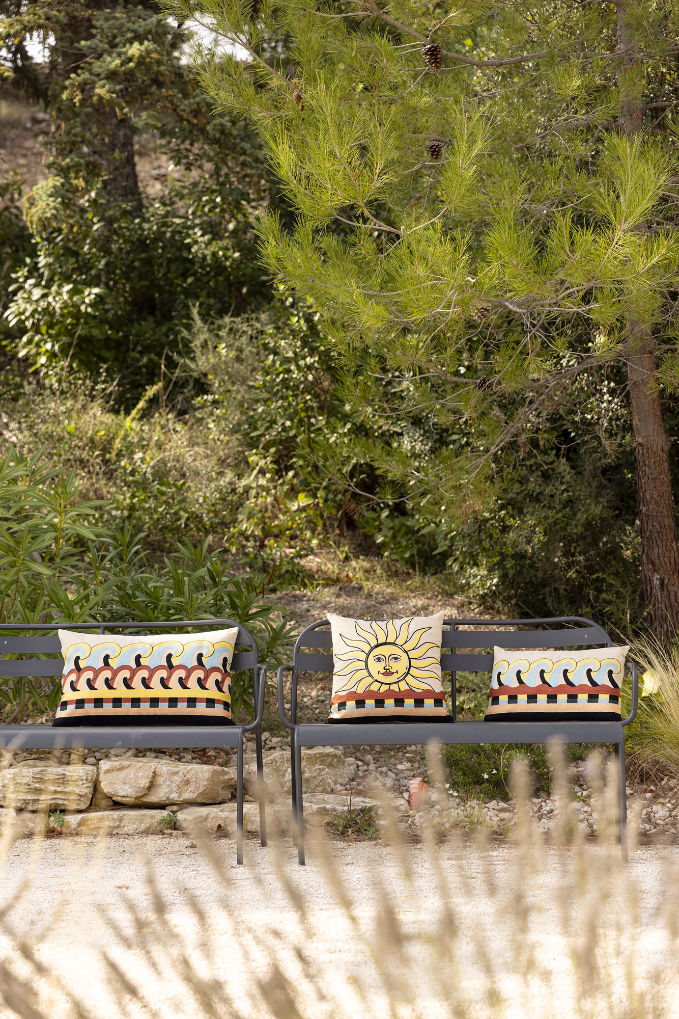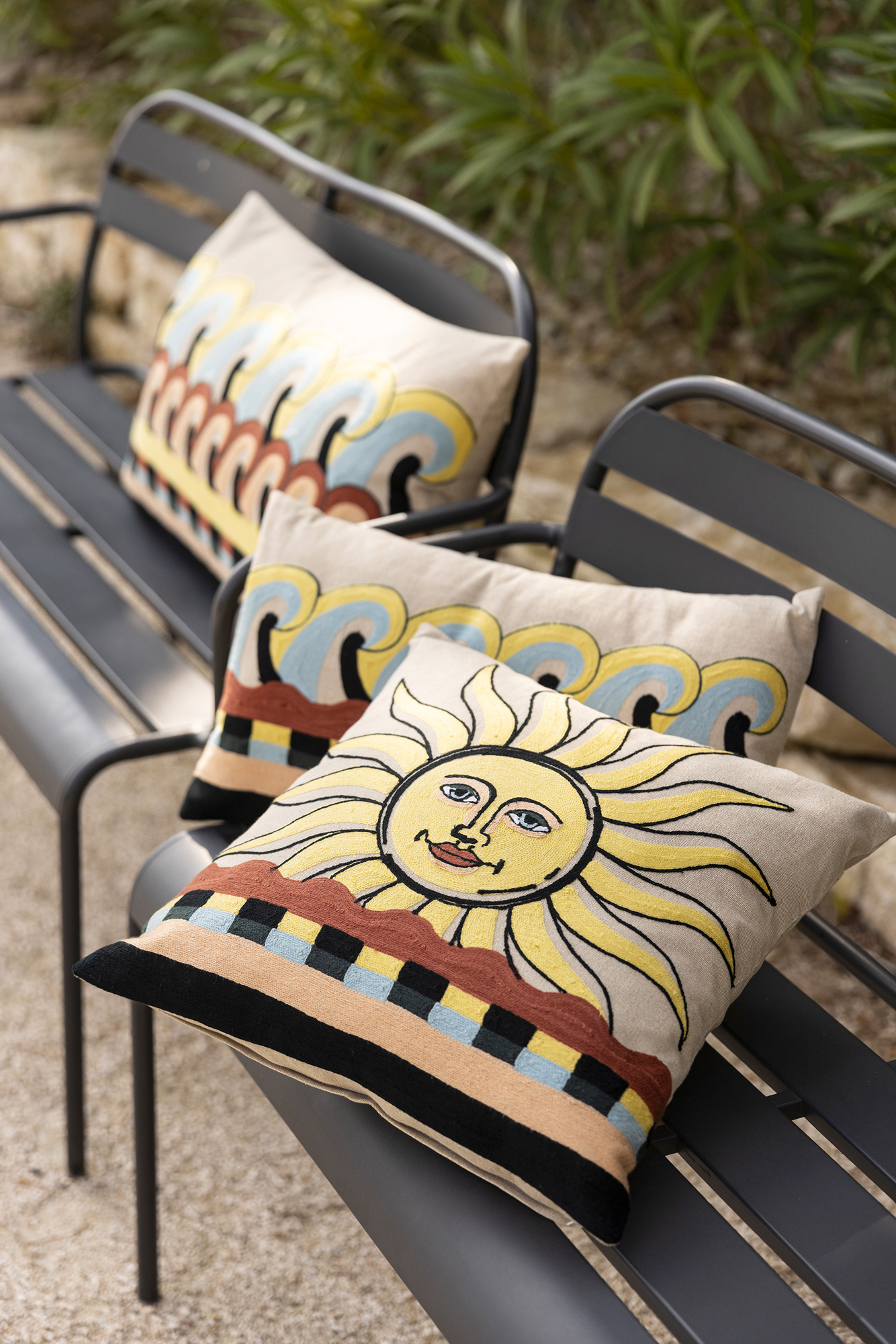 Le coussin brodé Adria insuffle une allure artisanale et joyeuse à la maison. En 100% coton, il offre une matière chaleureuse et un joli relief de broderie qui donne du caractère. Les motifs réinterprètent le mouvement des vagues et la lumière d'un soleil stylisé. Posé sur un canapé, un fauteuil ou un lit, il devient un accent déco expressif qui réveille la pièce.